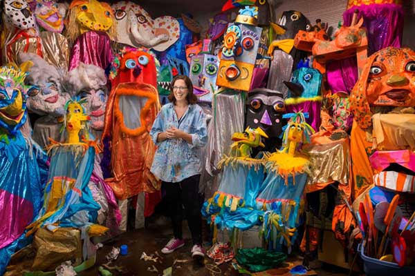 She explains her fascination with puppets through their ability to transform the wearer, pull attention, and share ideas: “There is a magic in making and becoming something bigger than yourself. Puppets make a statement in our world and can be used for both celebration and complaint. I love their versatility.” Alongside puppetmaking, Capezzuti has another studio art practice—Studio Capezzuti— focused on sculpting dryer lint into looming figures. “I can’t not make things. I make puppets, sculptures, and experiences and it always feels good to me. Since the beginning of humanity people have made things that are connected to their lives, both useful and beautiful. I think people in general would feel more centered if they spent more time creating–I think it is a basic human need.”